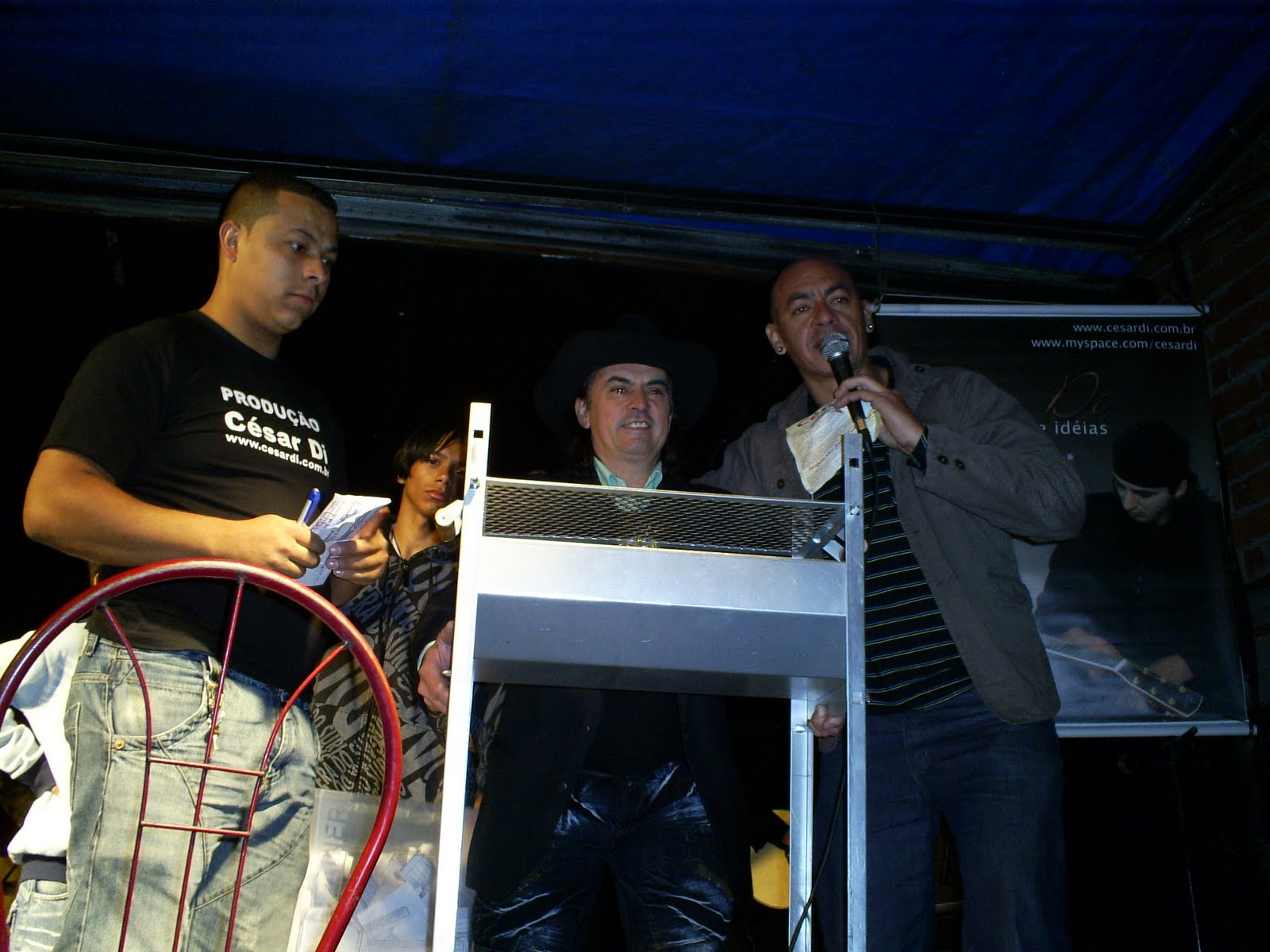 O Locutor Rocha Matos(À esquerda com microfone na mão, foi o comandante oficial do Evento e André Silva(Ao Centro) foi o responsável e coordenador geral da Produção César Di e do Evento)