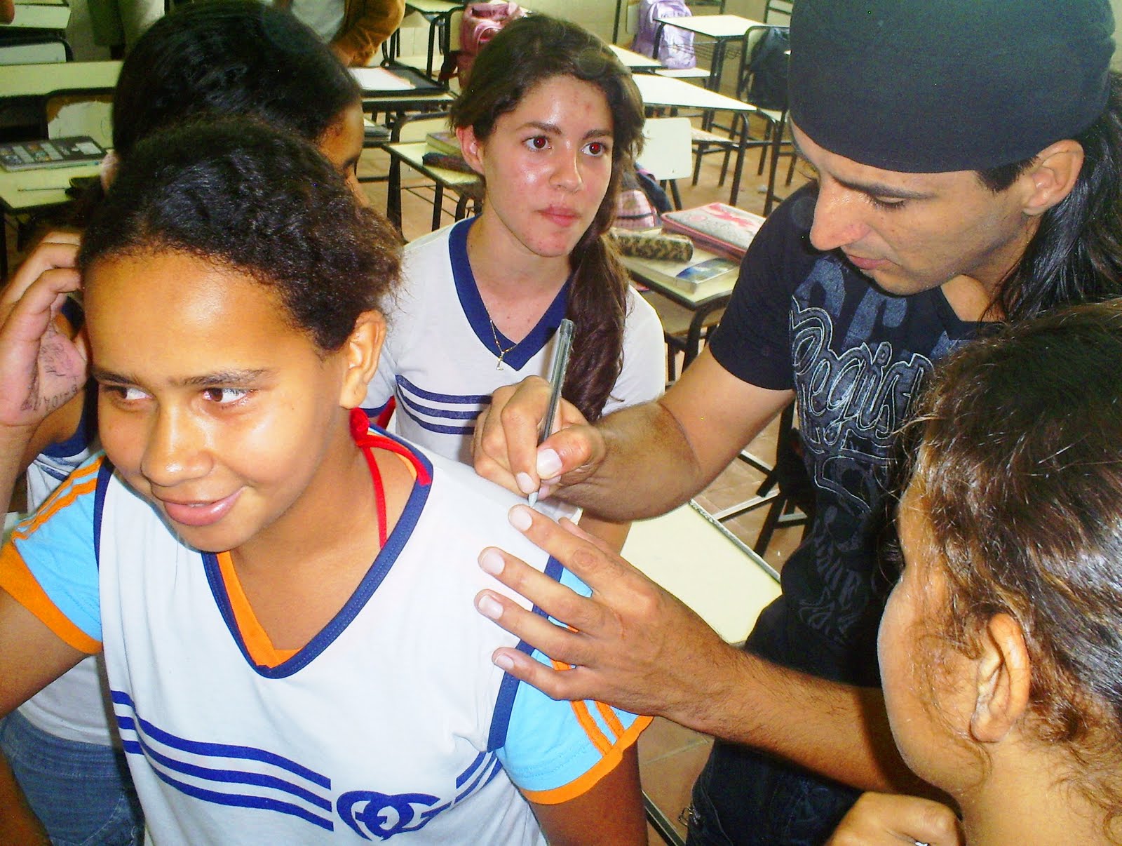 A visita do músico à escola deixou os alunos em polvorosa, todos queriam cantar, pegar autógrafos e fotografar ao lado artista.