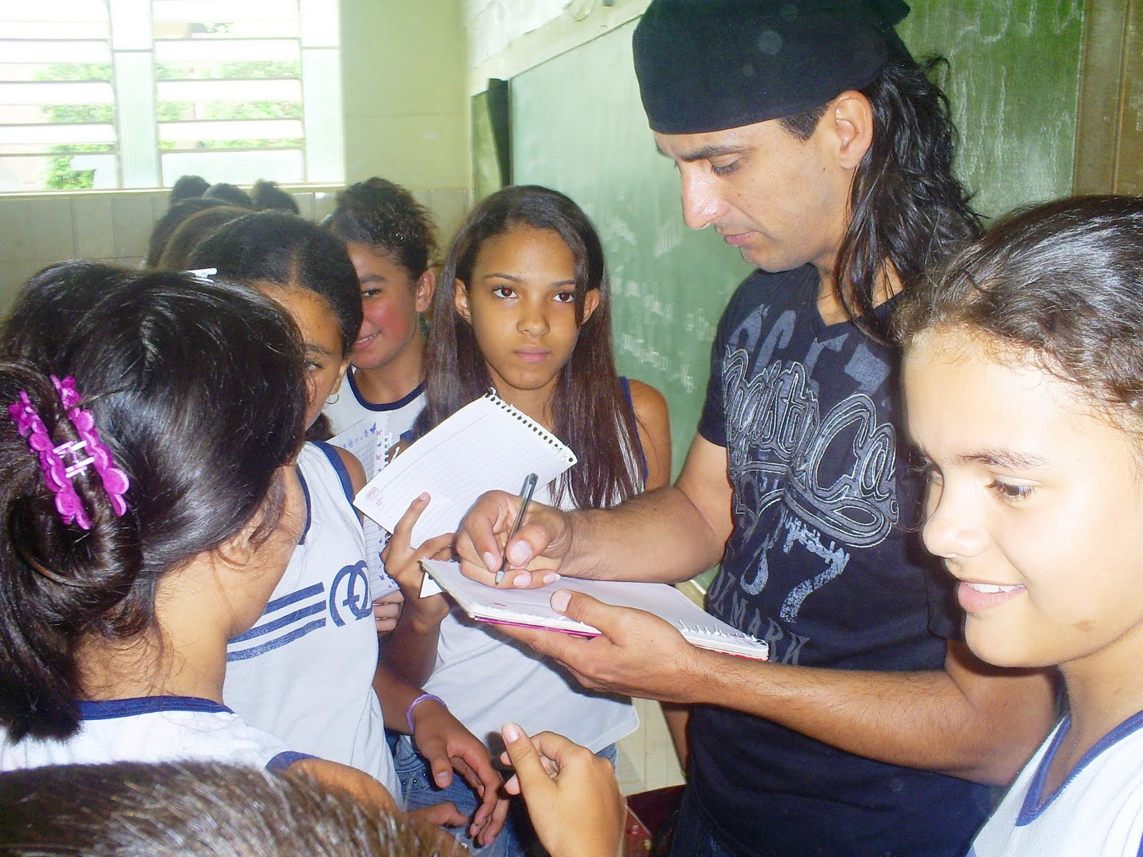 A visita do músico à escola deixou os alunos em polvorosa, todos queriam cantar, pegar autógrafos e fotografar ao lado artista.